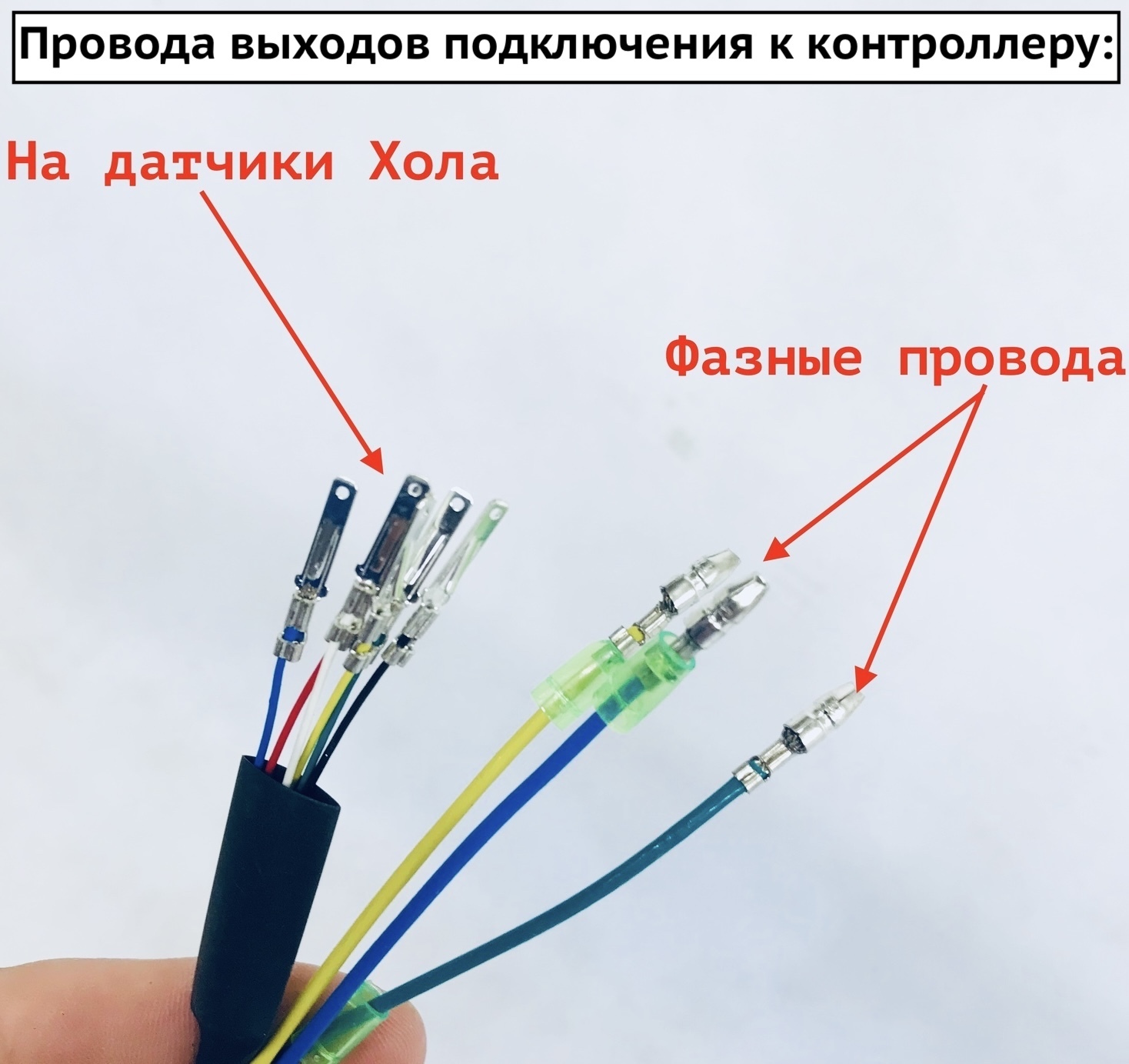 Для подключения мотора используется 3 толстых фазных провода и 5 тонких проводов от датчиков Холла (2 провода - питание, 3 - сигнальные).