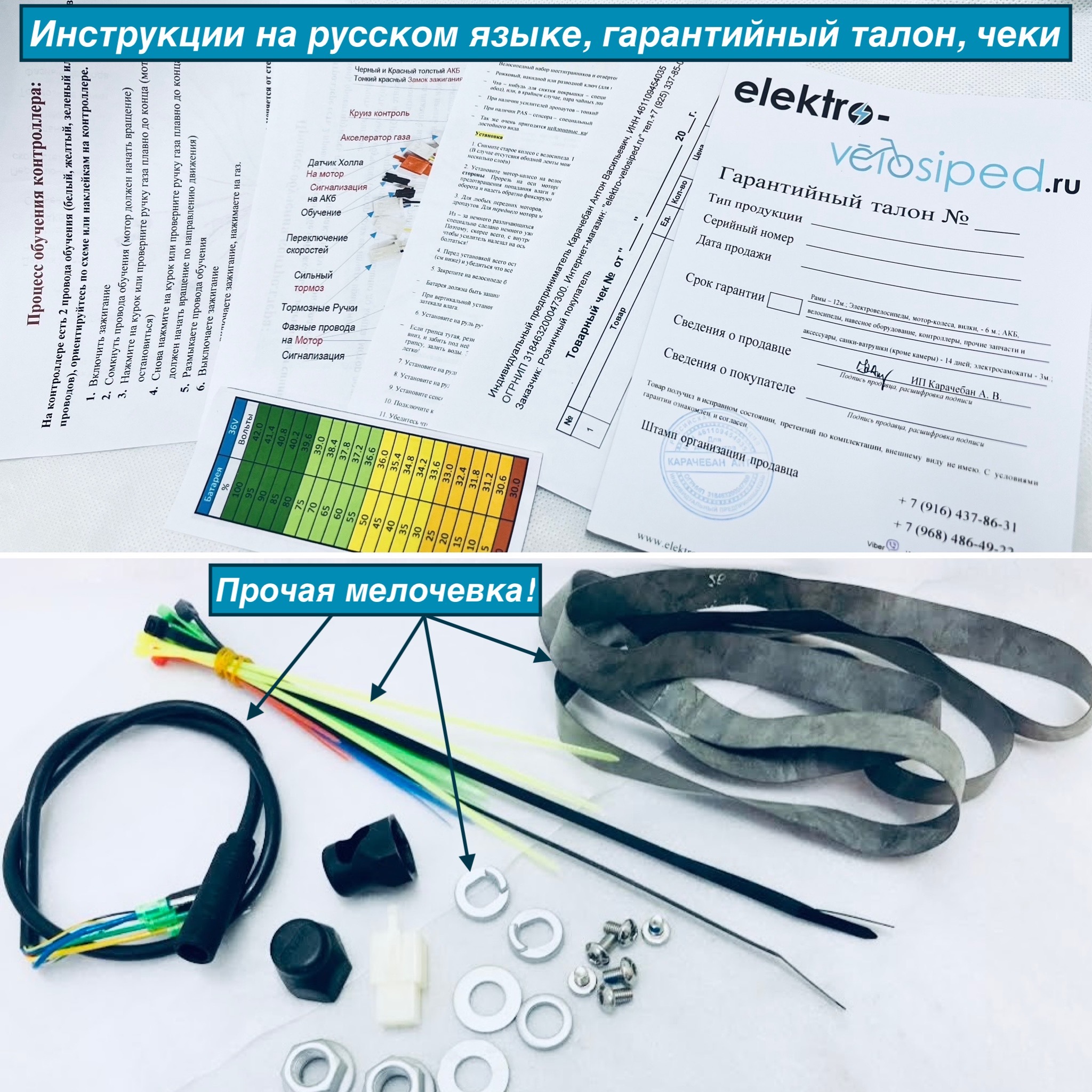 8. Инструкции по сборке и эксплуатации на русском языке, ободная флиппер-лента, гайки, зажимы, кабель, гарантийный талон и чеки с мокрой печатью ИП.