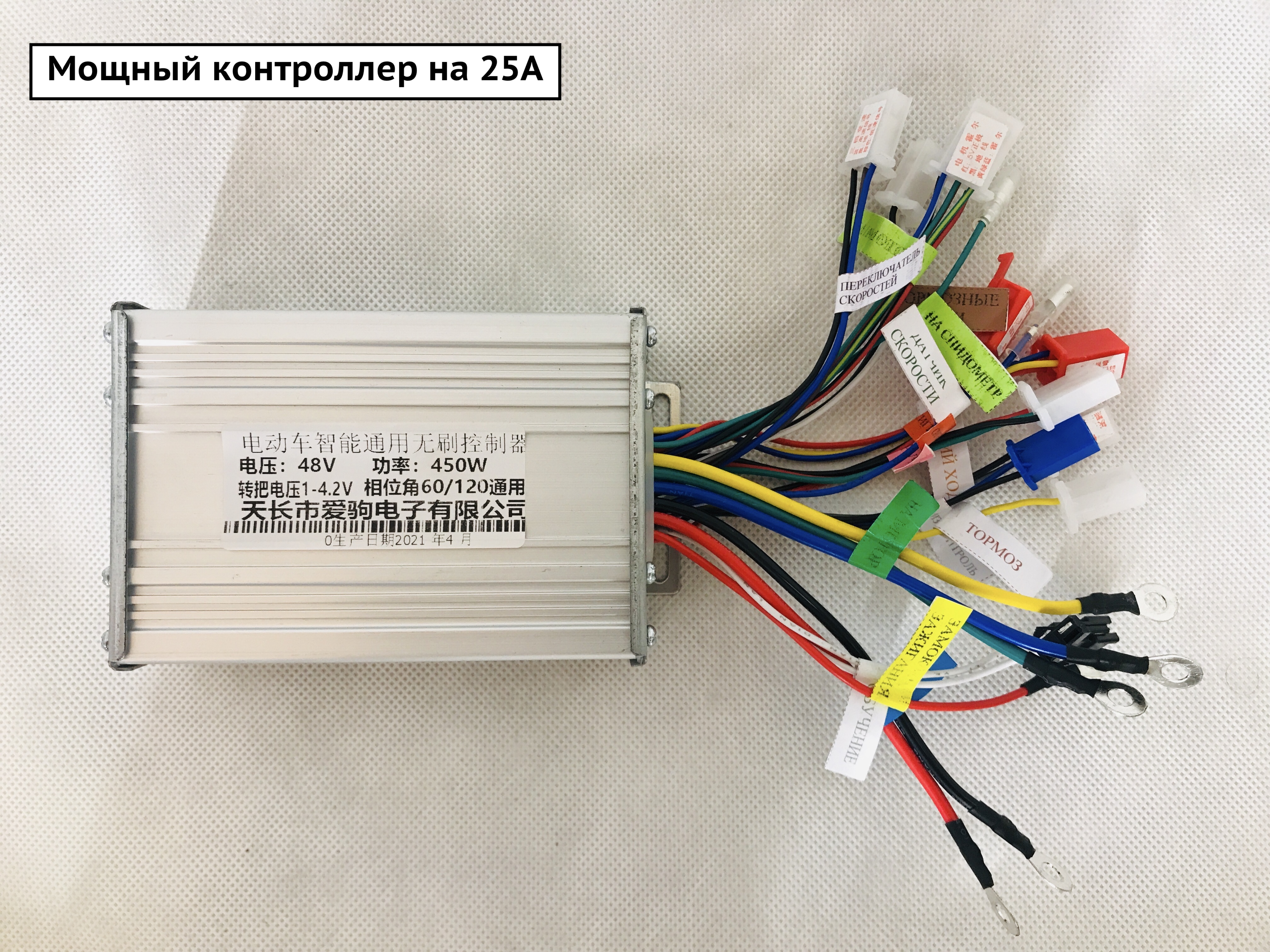 * На полный привод идут ДВА мотор колеса по 500 Ватт каждое (Переднее + заднее под трещетку), ДВА контроллера на 18A; Боксы под контроллер - 2шт. Все остальное по 1шт., управление идет с одной ручки или курка газа.